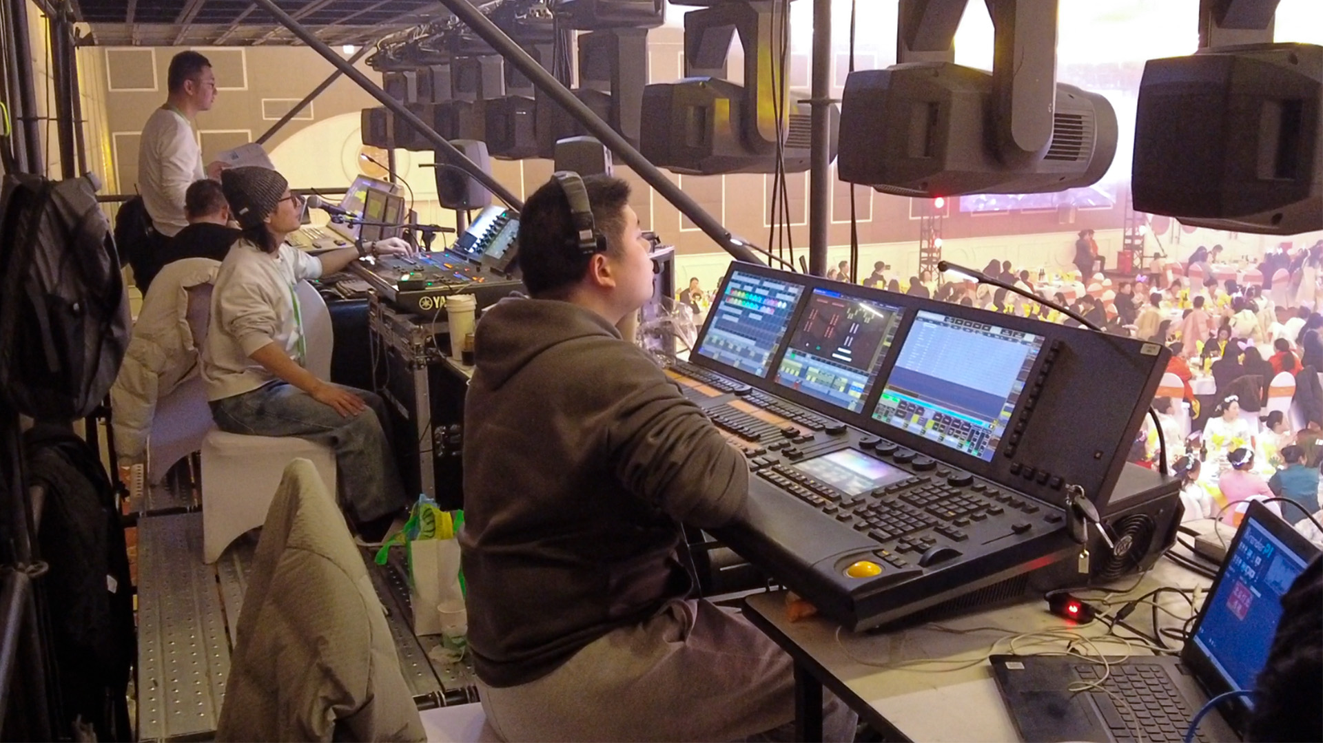 (工作人员操作灯光和大屏图)