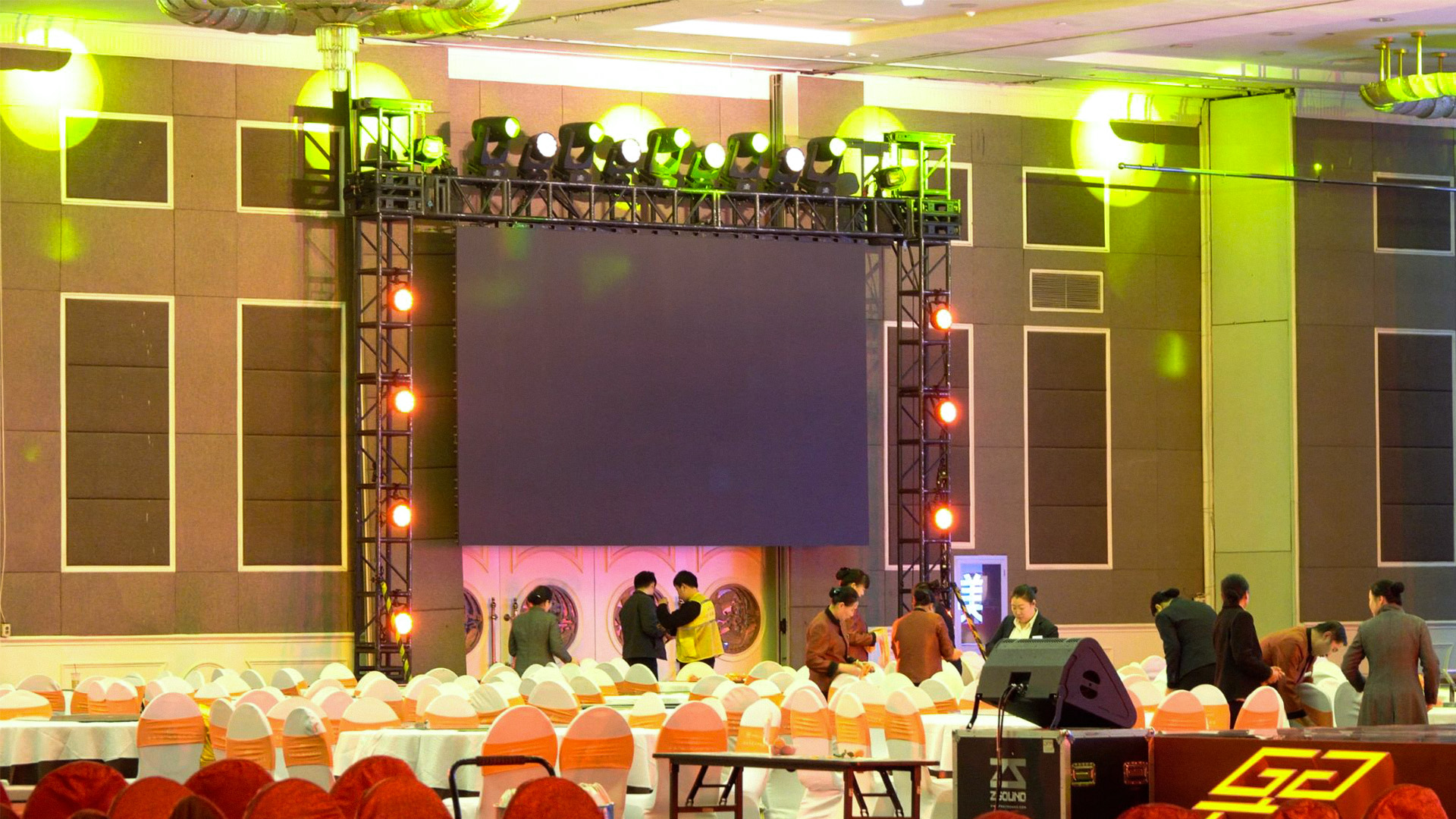 (工作人员操作灯光和大屏图)